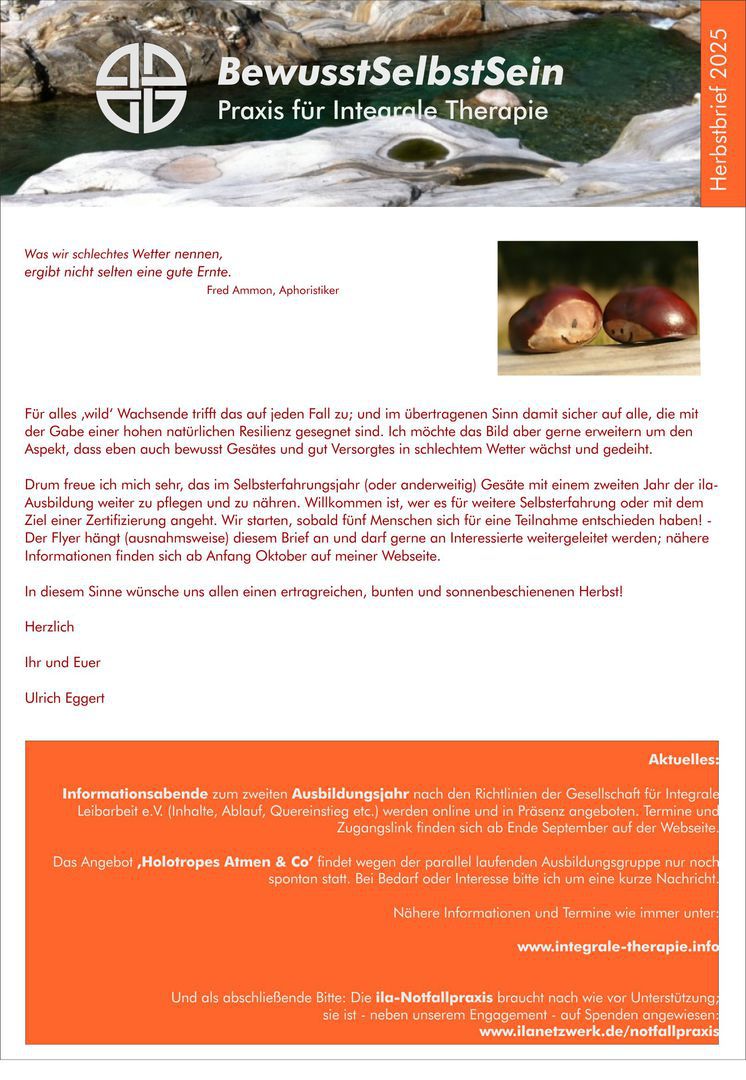 Und wie immer eine Bitte: Seit einger Zeit nehme ich teil an der ila-Notfallpraxis. Hier wird Menschen in Notsituationen eine kurzfristige Unterstützung durch Therapeutinnen und Therapeuten des ila-Netzwerks ermöglicht - auch um z.B. die Wartezeit auf einen Therapieplatz zu überbrücken. Die Notfallpraxis ist spendenfinanziert, so dass bis zu 10 (in Ausnahmefällen 15) Sitzungen zu einem vergünstigten Honorar von 20€ je Sitzung angeboten werden können. Weitere Informationen finden sich unter dem Link. Auch wenn Sie uns mit einer Spende unterstützen möchten, finden Sie dort die notwendigen Angaben.